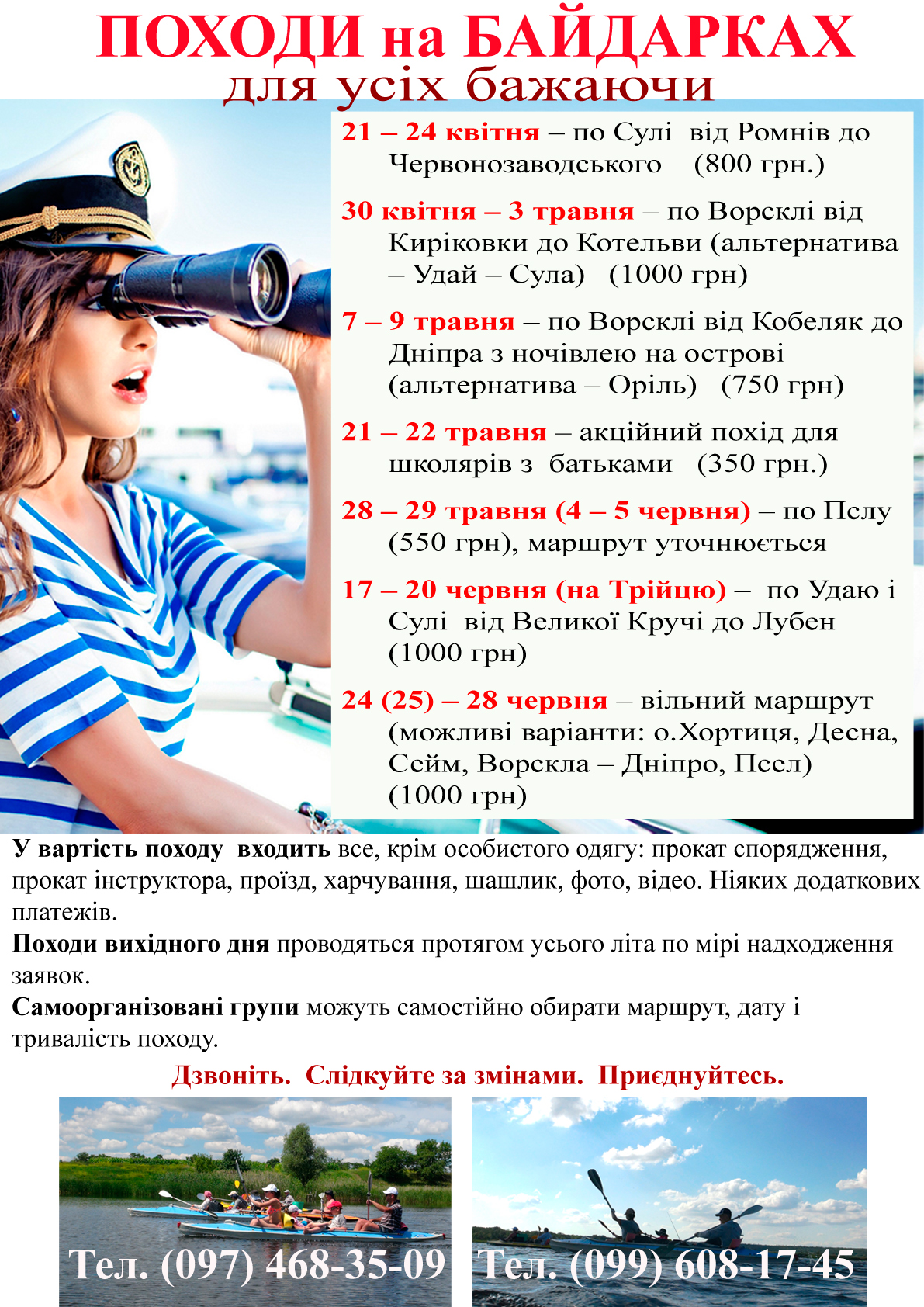 Обратите внимание! Информация может меняться. Подробный график походов и цены Вы можете узнать в группе ВК «На байдарках по Суле в апреле - готовимся.» - vk.com/event112578983 и на странице ВК vk.com/id161676642 а так же по телефонах: (097)468-35-09, (099)608-17-45